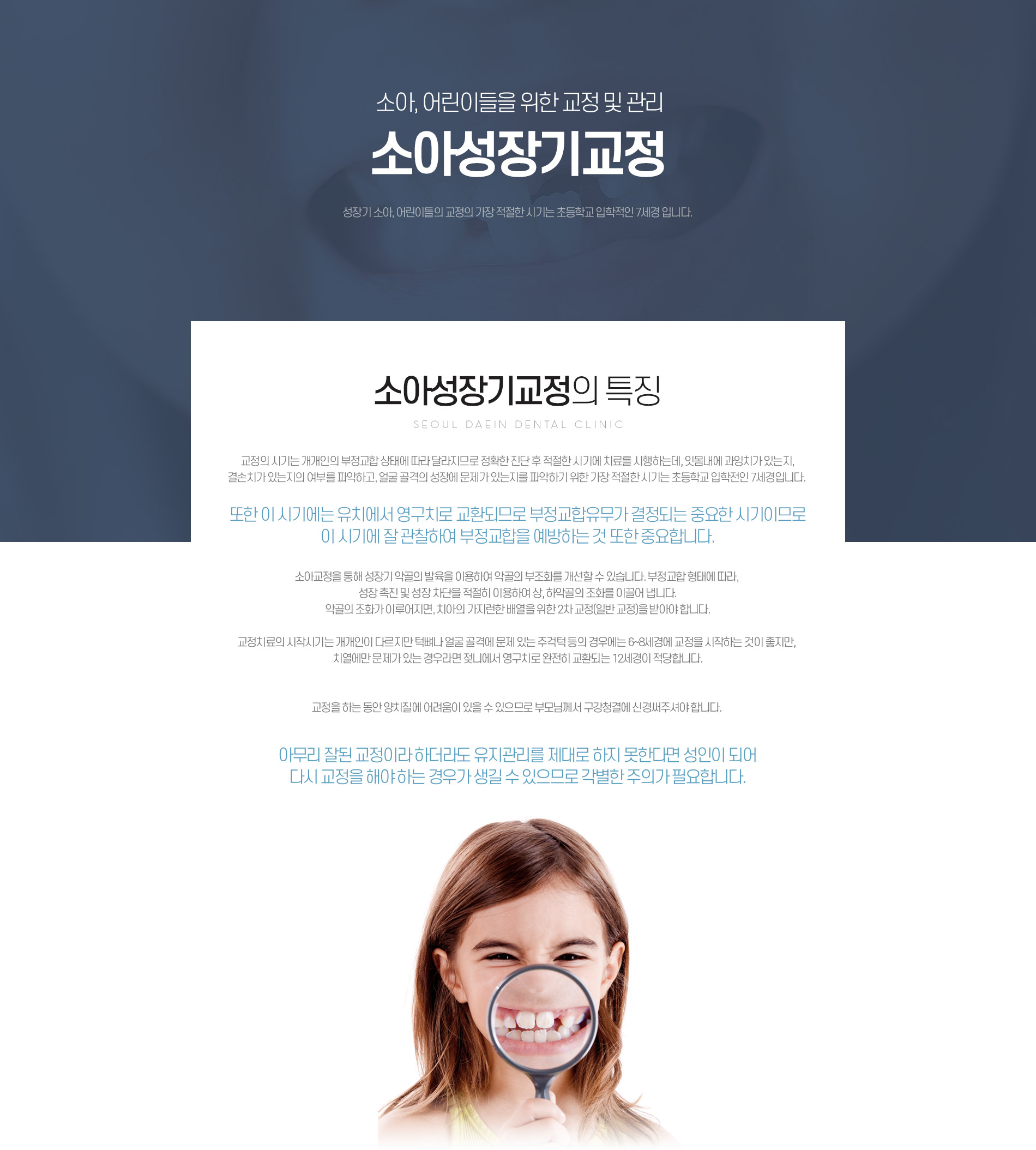 ±³Á¤ÀÇ ½Ã±â´Â °³°³ÀÎÀÇ ºÎÁ¤±³ÇÕ »óÅ¿¡ µû¶ó ´Þ¶óÁö¹Ç·Î Á¤È®ÇÑ Áø´Ü ÈÄ ÀûÀýÇÑ ½Ã±â¿¡ Ä¡·á¸¦ ½ÃÇàÇϴµ¥, ÀÕ¸ö³»¿¡ °úÀ×Ä¡°¡ ÀÖ´ÂÁö, °á¼ÕÄ¡°¡ ÀÖ´ÂÁöÀÇ ¿©ºÎ¸¦ ÆÄ¾ÇÇϰí, ¾ó±¼ °ñ°ÝÀÇ ¼ºÀå¿¡ ¹®Á¦°¡ ÀÖ´ÂÁö¸¦ ÆÄ¾ÇÇϱâ À§ÇÑ °¡Àå ÀûÀýÇÑ ½Ã±â´Â ÃʵîÇб³ ÀÔÇÐÀüÀÎ 7¼¼°æÀÔ´Ï´Ù.